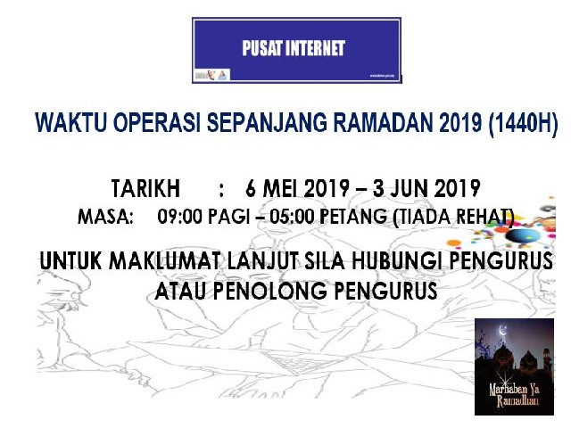 6 May 2019 | Aktiviti TerkiniBerikut adalah Notis Waktu Operasi Pusat Internet Pekan Bagan Serai pada bulan Ramadhan bermula 6 Mei - 3 Jun 2019
